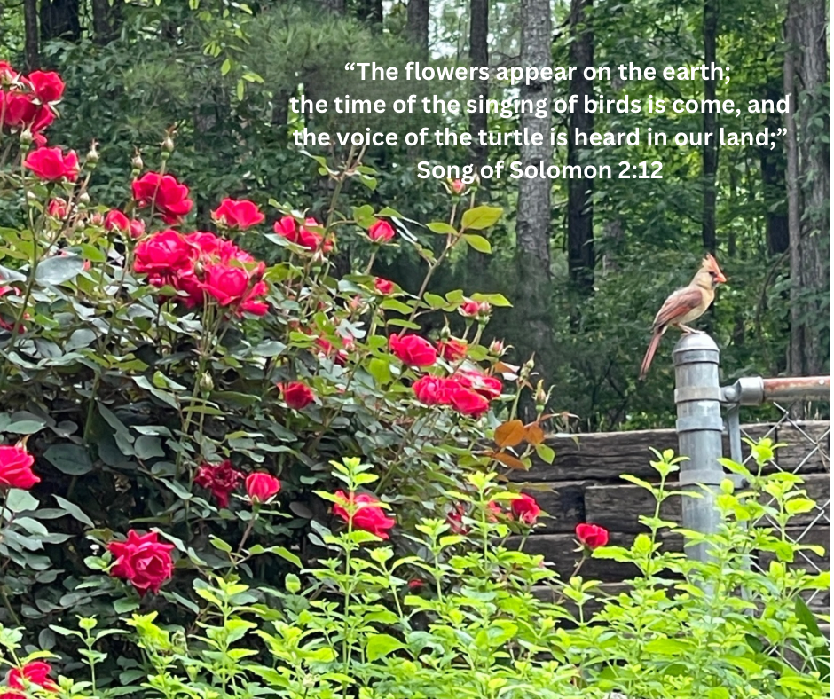 In John 15:5, Jesus reminds us, “I am the vine, ye are the branches: He that abideth in me, and I in him, the same bringeth forth much fruit: for without me ye can do nothing.” As the faith of believers grows stronger from His pruning, they blossom more brilliantly as a beautiful reflection of Jesus, drawing others to Him just as the springtime roses invite the butterflies and bees!