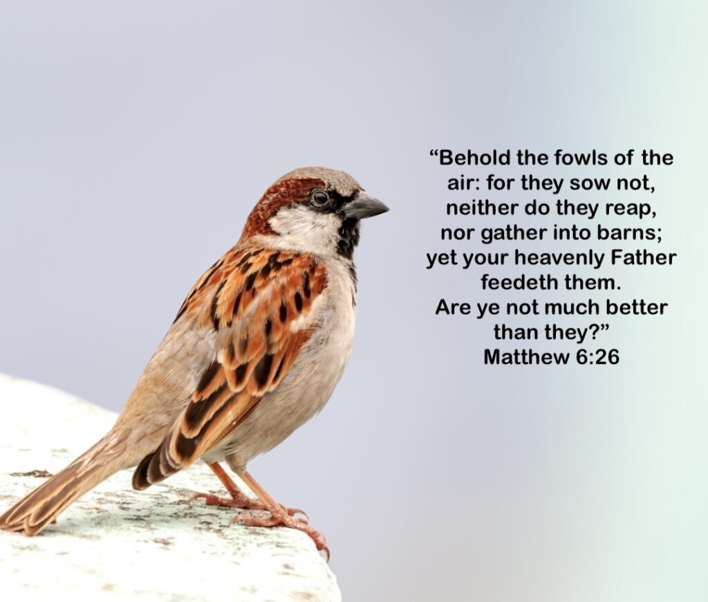 Scripture: “Behold the fowls of the air: for they sow not, neither do they reap, nor gather into barns; yet your heavenly Father feedeth them. Are ye not much better than they?” – Matthew 6:26
