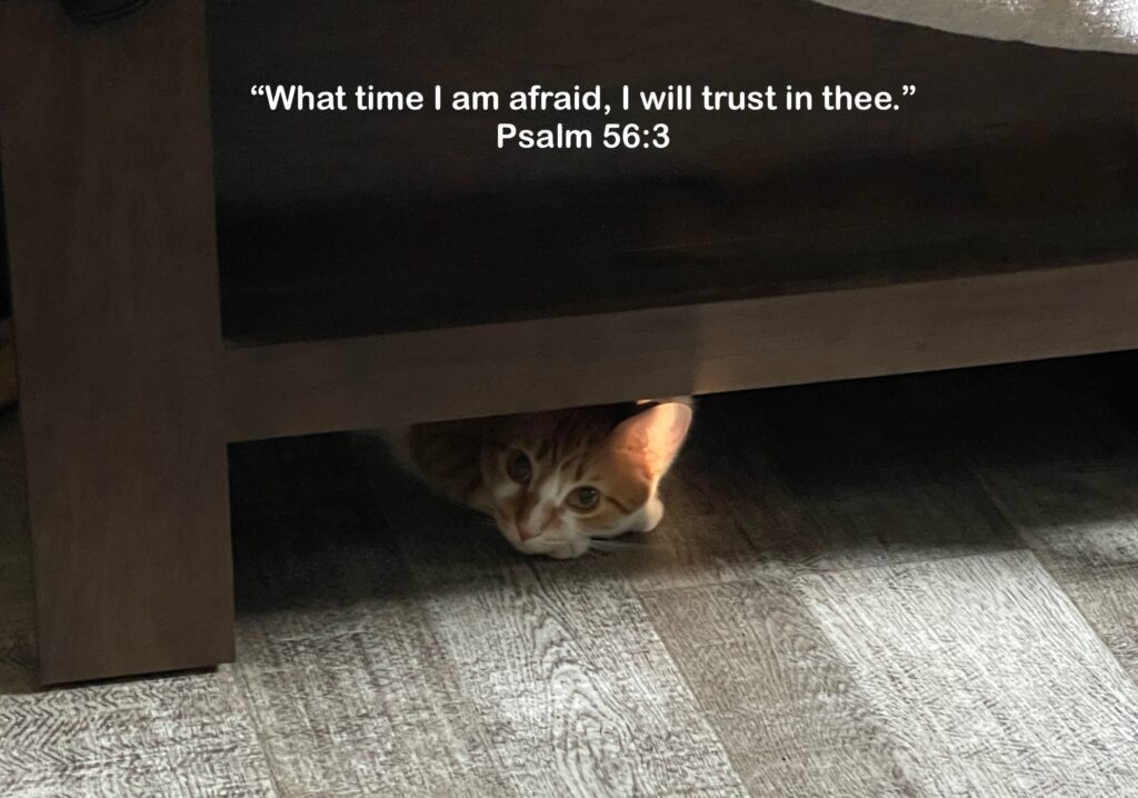 I tend to be a lot like my cat. When I think about things to come, I tend to imagine all sorts of negative outcomes, and that is when fears arise! That’s the time I want to go into hiding, but I can’t really do that. Instead, I run to God and try to be as close to Him as I possibly can because I know He is my protector. The Bible tells me in Psalm 46:1, “God is our refuge and strength, a very present help in trouble.” I know I can turn to Him because He promises to help me and keep me safe.